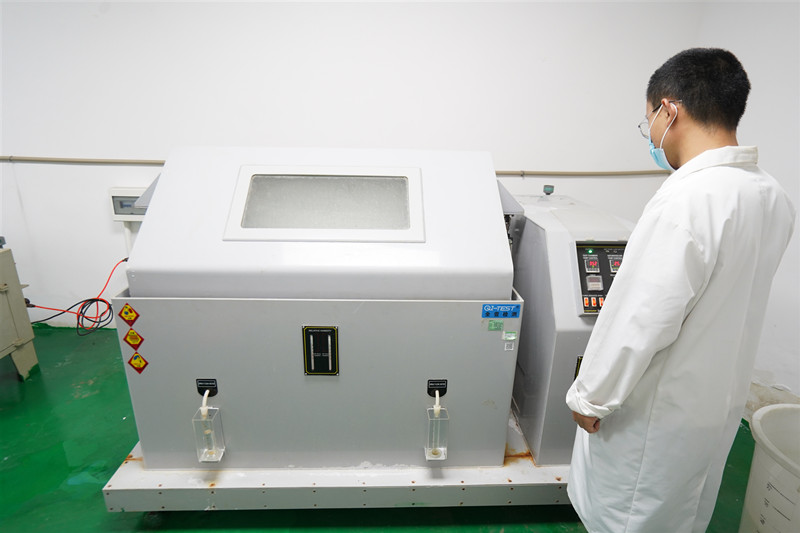 另一類為人工加速模擬鹽霧環(huán)境試驗(yàn)。人工模擬鹽霧環(huán)境試驗(yàn)是利用一種具有一定容積空間的試驗(yàn)設(shè)備——鹽霧試驗(yàn)箱,在其容積空間內(nèi)用人工的方法,造成鹽霧環(huán)境來對產(chǎn)品的耐鹽霧腐蝕性能質(zhì)量進(jìn)行考核。它與天然環(huán)境相比,其鹽霧環(huán)境的氯化物的鹽濃度,可以是一般天然環(huán)境鹽霧含量的幾倍或幾十倍,使腐蝕速度大大提高,對產(chǎn)品進(jìn)行鹽霧試驗(yàn),得出結(jié)果的時間也大大縮短。如在天然暴露環(huán)境下對某產(chǎn)品樣品進(jìn)行試驗(yàn),待其腐蝕可能要1年,而在人工模擬鹽霧環(huán)境條件下試驗(yàn),只要24小時,即可得到相似的結(jié)果。